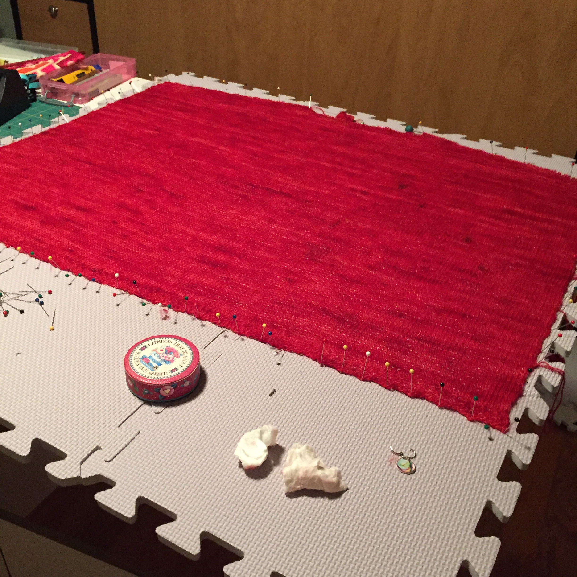 Also making great progress on my Poppy Boxy. I’m seaming the front and back together. I (foolishly?) decided to seam the shoulders as well as the sides.  I’m just over half done.  In order to seam the pieces, I blocked them. I was in such a rush to block the back, I forgot to take the row progress markers off. The cute little black sheep bled a little and I’ve got a few spots. It it doesn’t come out when I block the finished sweater, I’ll duplicate stitch over the spots to hide them.