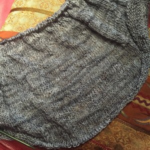 I’m making very S L O W progress on the test knit I volunteered to do.  I picked a very delicate loosely plied 2-ply lace weight yarn so it’s slow going.  I’m not in love with my needles.  Might order some Karbonz and see how they work.  Can’t use my metal needles…. the yarn slips off the tips too easily.  Here’s a close-up of the fabric.  (There will be beads on the last section!)